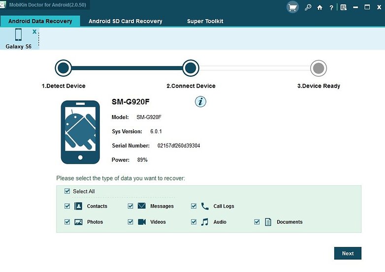 - Setelah terhubung, ia akan menampilkan data ponsel Anda, seperti model, versi sistem dan lain-lain dan memungkinkan Anda memilih jenis data yang ingin Anda ambil. Seperti yang dapat Anda lihat dari gambar di bawah, Anda dapat mengambil kontak, foto, pesan, log panggilan, foto, video, audio dan dokumen. Pilih Next untuk melanjutkan ke langkah berikutnya.