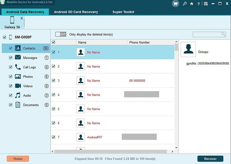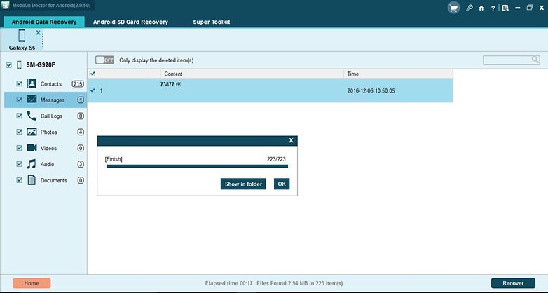 - Selanjutnya data anda akan diambil dalam beberapa saat dan akan ditampilkan seperti pada gambar di bawah ini, terbagi menjadi berbagai jenis data. Anda dapat memilih hanya menampilkan item yang dihapus. Pilih masing-masing pesan, atau file data, atau Anda dapat memilih semuanya dengan memilih kotak centang di posisiSelanjutnya, pilih Recover untuk mengambil data yang hilang atau terhapus.