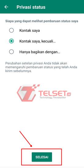 - Terdapat 3 opsi pilihan. Untuk menyembunyikan status WA dari orang tertentu, silakan pilih Kontak Saya kecuali atau My Contacts except.