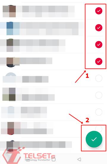 - Anda akan diarahkan ke daftar kontak. Silakan berikan tanda ceklis berwarna merah untuk kontak orang-orang tertentu, yang tidak Anda izinkan untuk melihat status WA. Setelah itu klik tanda ceklis di bagian bawah.
