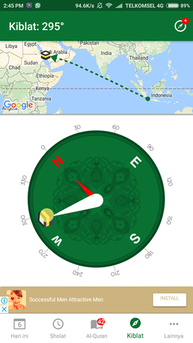Selain itu juga, jika kebetulan Anda sedang di luar kota dan tidak tahu arah kiblat, jangan khawatir karena aplikasi ini pun menyediakan fitur Kiblat yang memungkinkan Anda mengetahui arah kiblat sesuai lokasi saat itu Anda berada.
