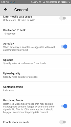 Caranya mudah kok. Buat pengguna smartphone Android, Anda bisa masuk ke menu Settings, kemudian ke bagian General. Scroll ke bagian bawah, dan ubah toggle Restricted mode ke posisi On.