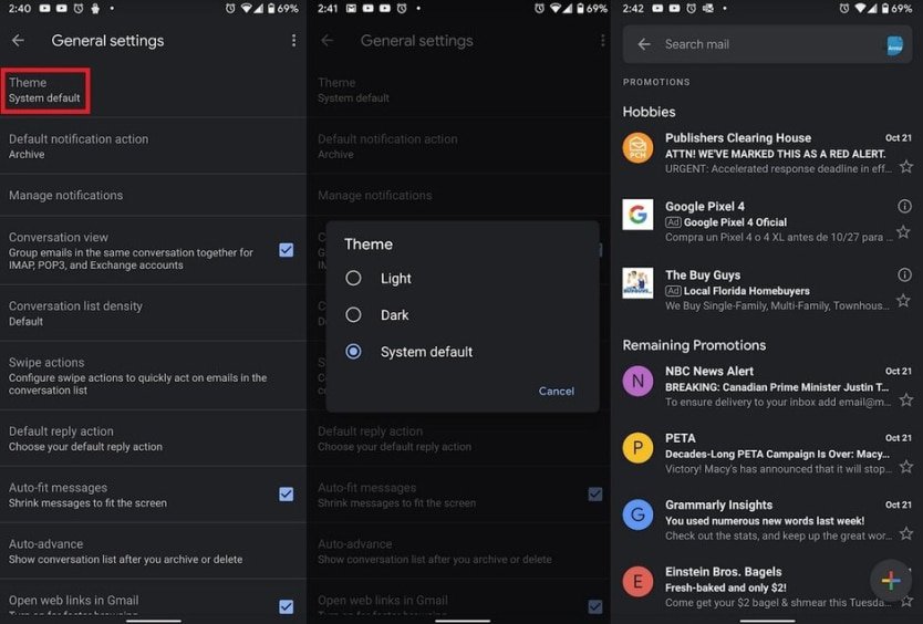- Kemudian, pilih opsi Dark, dan otomatis tampilan antarmuka aplikasi Gmail akan langsung berubah menjadi warna hitam.