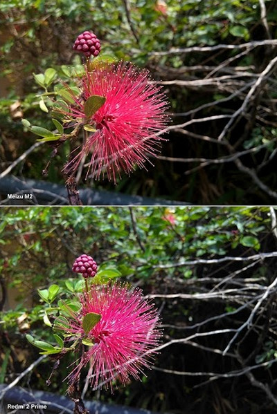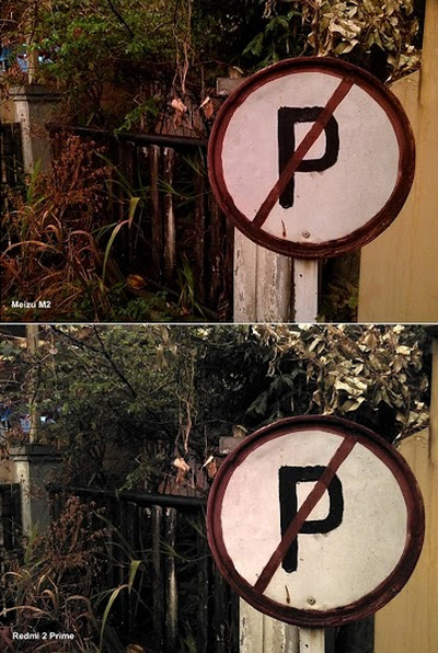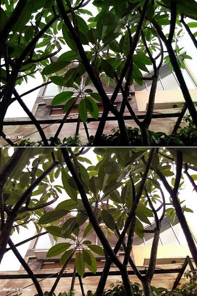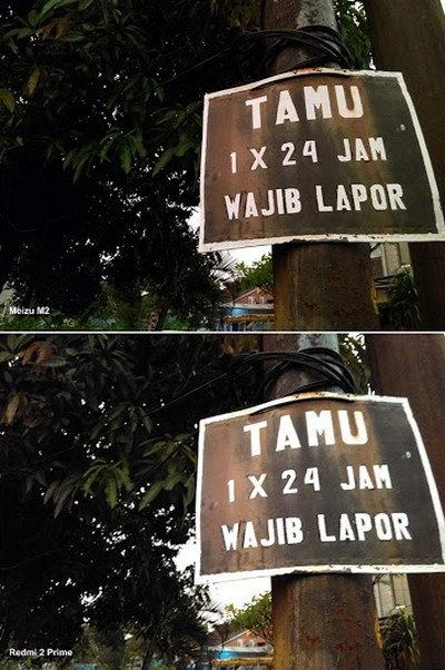 Sore hari, menjelang malam dengan sinar matahari sisa kekuningan.Terlihat karakter kamera dari Meizu M2 menghasilkan foto yang lebih warm, sedang Redmi 2 Prime lebih memilih cold. Redmi 2 Prime memilih untuk lebih memutihkan object berwarna putih, sehingga detail warna yang dekat dengan object putih menjadi kabur, hasil warna lainnya, seperti daun, jadi terlihat pucat.