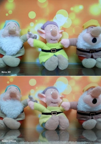 Foto boneka kurcaci ini diambil menggunakan kamera selfie depan. Secara ukuran MP, Meizu M2 lebih mengikuti trend dimana ukuran kamera depan atau selfie semakin membesar (5MP), sedangkan Redmi 2 Prime tetap menggunakan resolusi dari Redmi 2 sebelumnya di 2MP. Foto ini diambil dibawah penerangan yang sangat cukup, didalam ruangan yang berlimpah sinar matahari dari jendela.