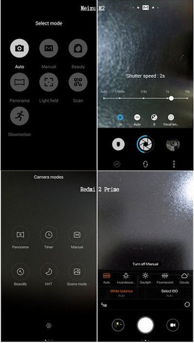 Dari sisi fitur setting kamera manual, Meizu M2 bisa dikatakan lebih unggul dibanding Redmi 2 Prime, karena fitur manual-nya meliputi shutter speed (bukaan lensa kamera bisa sampai 10 detik), ISO, AE, dan Focal Length. Sementara fitur manual ini di Redmi 2 Prime hanya White Balance dan ISO.