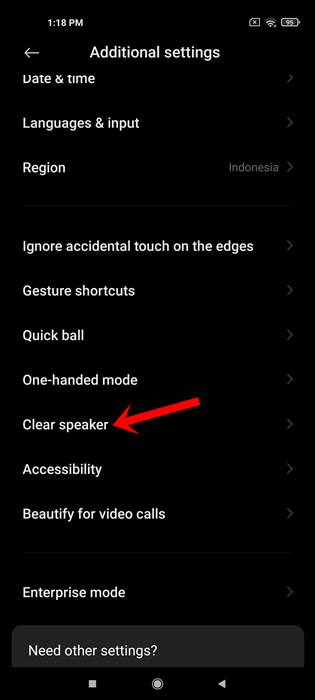 - Di dalam Additional Settings, Anda akan menemukan fitur Clear Speaker.