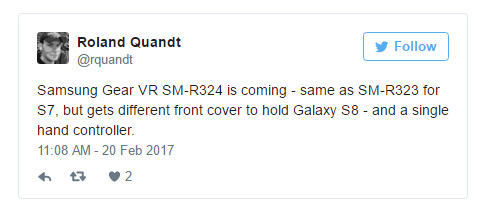 Menurut Roland Quandt (@rquandt) dalam Tweet-nya mengatakan, Gear VR baru akan memiliki nomor model SM-R324 , dan itu akan menampilkan sampul depan baru yang dapat memegang Galaxy S8 dan Galaxy S8 Plus.