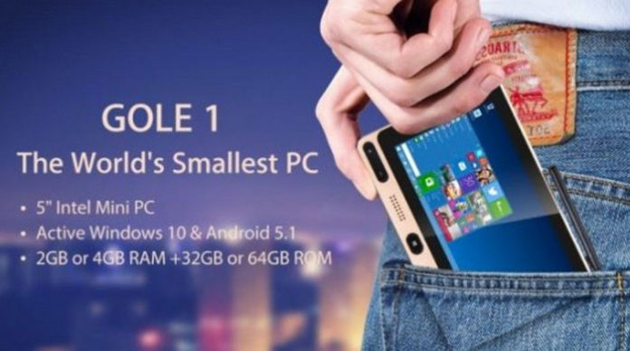 GOLE 1 resmi diumumkan sebagai PC paling kecil berbasis Windows 10 dan prosesor Intel Atom. GOLE 1 memiliki dimensi 5,3 x 3,6 x 0,8 inci dan bobot 198 gram, serta dilengkapi layar IPS 5 inci (5-point multitouch) dengan tingkat resolusi 1280 x 720p.