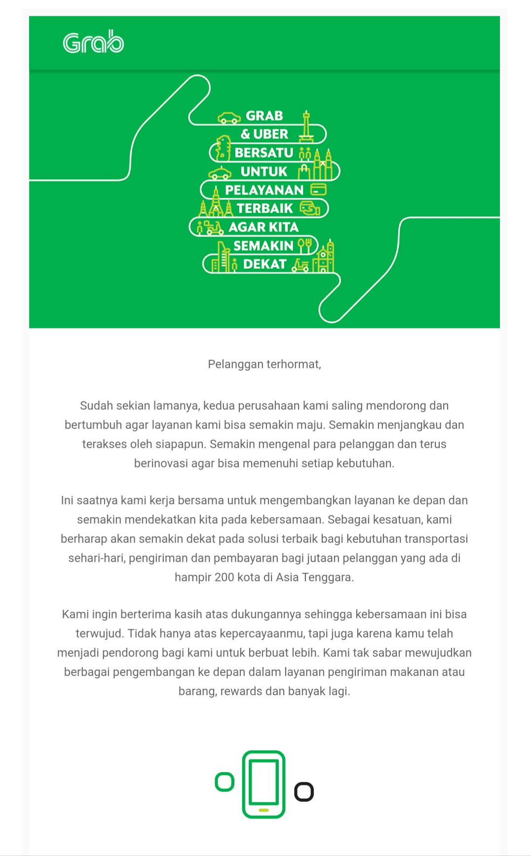 Klarifikasi ini diberikan lewat email yang diterima tim Telset.id, Senin (26/3/2018). Dalam email tersebut, Grab dengan bangga menyatakan dirinya telah bersatu dengan perusahaan ride sharing asal Amerika itu.
