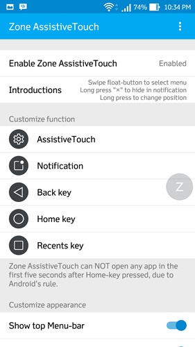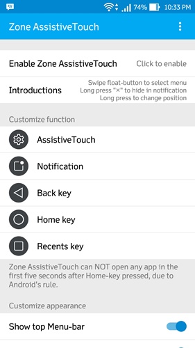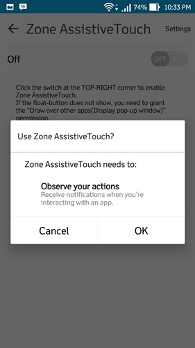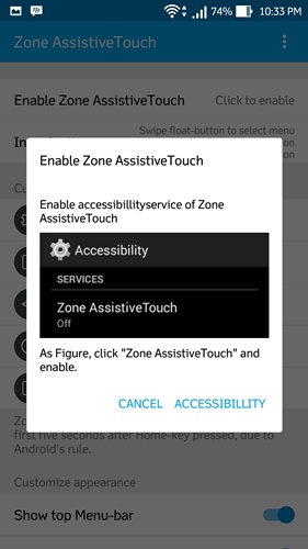 - Kemudian, jalankan aplikasinya dan aktifkan aplikasi ini untuk menghadirkan QuickBall ala MIUI 8 dengan menekan tombol Enable Zone AssistiveTouch. Selanjutnya, tekan tombol Accessibility untuk mengaktifkan fitur ini pada pengaturan Accessibility dengan mengubah toggle ke posisi On.