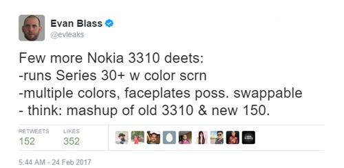 Lewat akun @evleaks, Blass membocorkan beberapa hal tentang Nokia 3310 versi modern. Menurutnya, Nokia 3310 akan berjalan pada Series 30+ yang merupakan OS feature phone yang juga berjalan pada feature phone milik Nokia seperti Nokia 150.