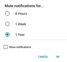 - Selanjutnya, pilih waktu lamanya notifikasi itu dimatikan. Ada beberapa pilihan yang bisa Anda sesuaikan yakni 8 jam, 1 minggu dan 1 tahun. Jangan lupa juga hilangkan toggle pada bagian Show Notifications.