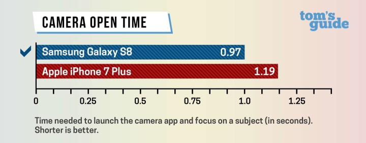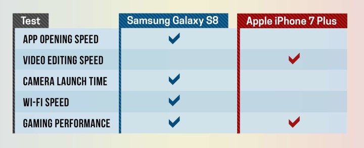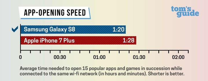 Tes kecepatan mencakup hal-hal seperti kecepatan pembukaan aplikasi dan kamera, pengeditan video, kecepatan Wi-Fi, dan kinerja game. Galaxy S8 di atas iPhone 7 ke dalam hal, kecuali tes video editing dan gaming performance, tidak mengherankan karena iPhone 7 memiliki lapisan virtual yang disembunyikan antara perangkat keras dan sistem operasi yang memungkinkan kinerja lebih cepat.
