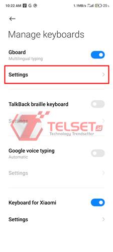 - Selanjutnya, klik Manage Keyboard dan pilih Settings di bagian Gboard.