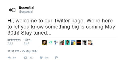 Kehadiran smartphone Essential tersebut “dikonfirmasi” lewat cuitan di akun Twitter resmi mereka @essential, yang menyebutkan bahwa pada 30 Mei mendatang ada “sesuatu yang besar” akan hadir. Dari sinilah kemudian muncul spekulasi bahwa yang dimaksud “sesuatu yang besar” itu adalah smartphone Essential.