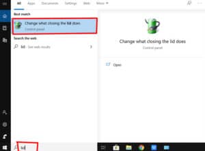 Untuk mempersingkat langkah, Anda bisa langsung masuk ke menu pengaturan Lid dengan melakukan pencarian di kolom Search Bar. Yaitu dengan mengetikan kata “Lid” dan pilih menu “Change What Closing Lid Does”, maka anda akan langsung masuk ke menu pengaturan Lid.