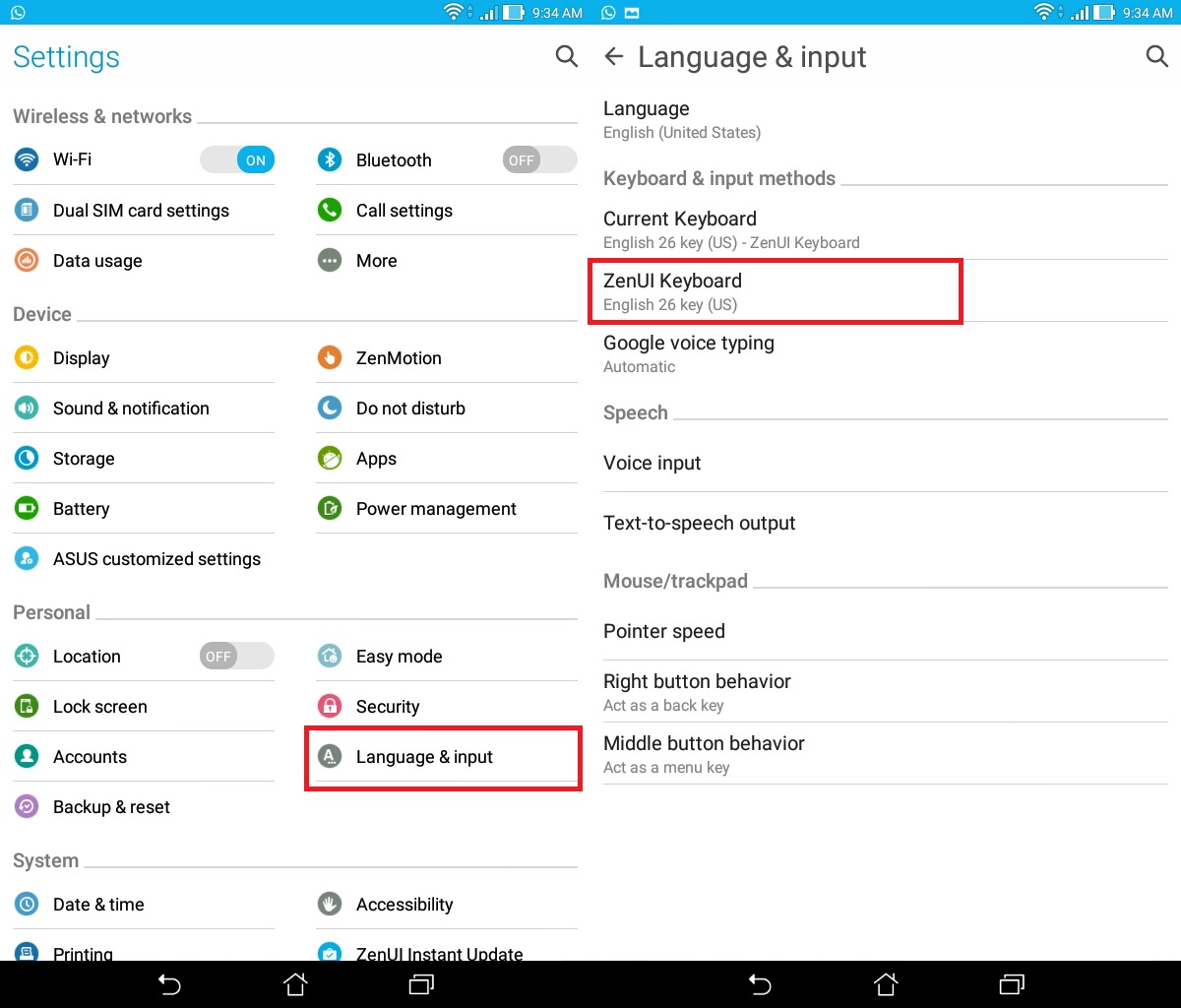 Nah, jika Anda pengguna keyboard bawaan pabrikan, caranya pun sama. Pertama buka Setting, lalu pilih Language & Input, kemudian pilih keyboard yang dipakai. Sebagai contoh, kami menggunakan ZenUI Keyboard.
