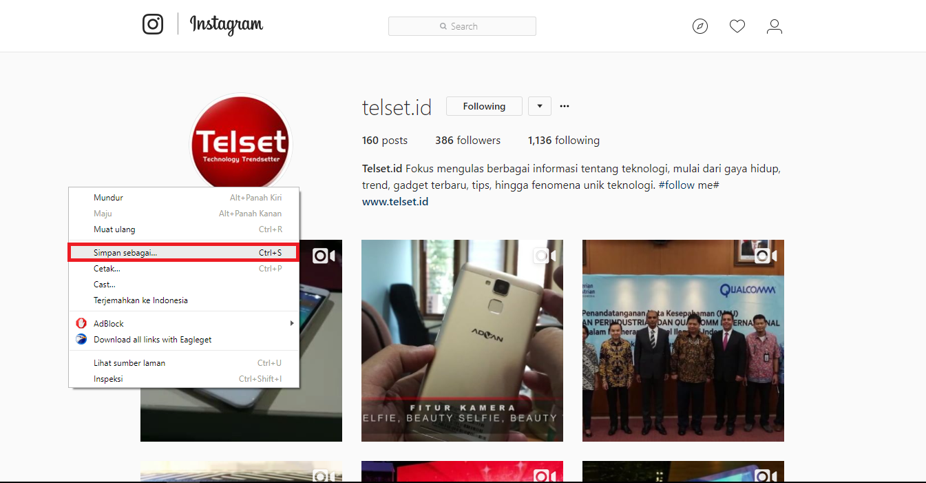 Caranya adalah buka laman Instagram yang ingin foto atau videonya ingin di unduh melalui browser desktop, misalnya laman Instagram Telset.id.