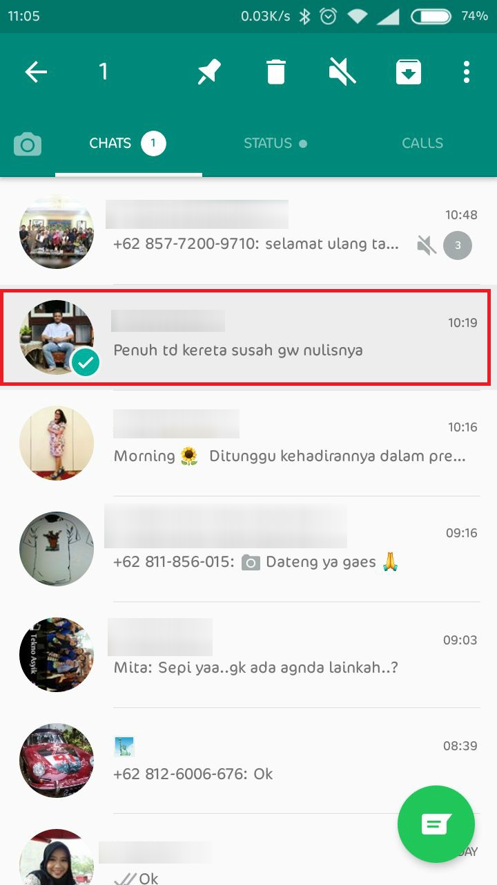 Pertama, buka aplikasi WhatsApp. Setelah terbuka, pilih percakapan mana yang akan disembunyikan. Setelah menentukan chat mana yang akan disembunyikan, tekan dengan lama chat tersebut sehingga ada tanda ceklis di chat tersebut.