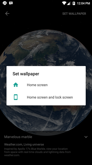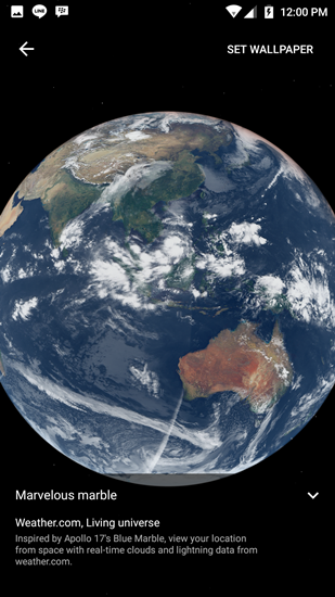 - Sebagai saran, Anda bisa coba Live Wallpapers “Marvelous marble” karena wallpaper tersebut akan mendeteksi lokasi Anda dan kemudian menampilkan tampang bumi sesuai lokasi Anda secara real-time, termasuk kondisi cuacanya.