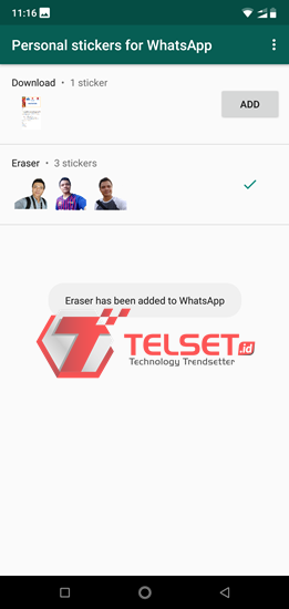 - Ketika muncul halaman popup, tekan tombol Add, hingga muncul tulisan Eraser has been added to WhatsApp.