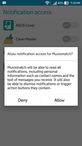 - Jika sudah, jalankan aplikasi itu kemudian aktifkan lirik lagu pada pemutar musik yang digunakan dengan menekan tombol Enable Now. Kemudian Anda akan diarahkan ke pengaturan Notification Access, ubah toggle Musixmatch ke posisi On dengan menekan tombol Allow.
