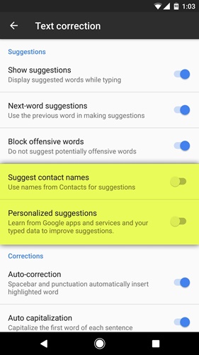 - Nah dari sini, Anda akan masuk ke pengaturan dari Gboard. Langkah selanjutnya adalah masuk ke bagian Text Correction, kemudian matikan opsi Suggest contact name dan juga Personalized Suggestions.