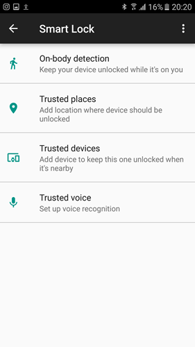 Kemudian ada Trusted Place yang memungkinkan smartphone tidak terkunci ketika berada di tempat yang Anda inginkan, seperti kantor, rumah, tempat makan, rumah pacar dan lainnya. Selanjutnya ada Trusted Devices yang membuat smartphone tetap terbuka ketika terhubung dengan perangkat lainnya seperti smartband, smartwatch, dan lainnya.