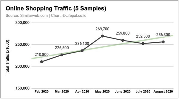 Tercatat pertumbuhan berada di angka 21.6% selama 7 bulan terakhir. Lifepal menggunakan data traffic lima situs sebagai sampel yaitu Tokopedia.com, Shopee.co.id, Bukalapak.com, Lazada.co.id, dan Blibli.com.