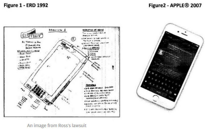Ross mengatakan dia mengajukan paten perangkat bernama “electronic reading device” (ERD) pada tahun 1992. Dia mengklaim iPhone memiliki desain yang dijiplak dari gambar teknis paten ERD yang ia ajukan 15 tahun sebelum Apple meluncurkan iPhone (tahun 2007).