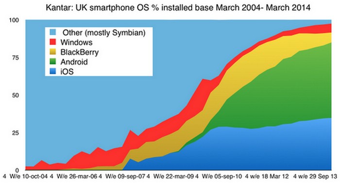 Jakarta – Sebuah grafik yang dirilis oleh Kantar belum lama ini menunjukkan pangsa pasar sistem operasi mobile di Inggris selama sepuluh tahun terakhir, dari Maret 2004 sampai Maret 2014.