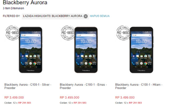 BlackBerry Aurora bahkan telah masuk di lapak dua toko online Indonesia, yakni Elevenia dan Lazada. Kedua online store ini telah memposting iklan untuk pre-order BlackBerry Aurora. Ponsel ini dibanderol seharga Rp 3,499 juta, dan tersedia dalam tiga varian warna, yakni Black, Gold, dan Silver. Pengiriman diharapkan mulai pada 3 Maret.