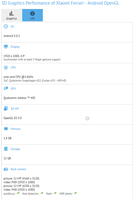 Menurut tes, handset ini akan menampilkan layar 4,9 inci dengan resolusi 1080 x 1920. Di bawahnya, sebuah prosesor hexa-core 1.6GHz Snapdragon 615 hadir menemani GPU Adreno 405, RAM 2GB serta ruang penyimpanan 16GB.