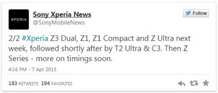 Lewat akun Twitter resminya, Sony Mobile men-tweet kabar soal rencana perilisan Android Lollipop untuk sejumlah perangkat Sony. Ada empat perangkat yang akan segera mendapatkan update Lollipop, yakni Xperia Z3 Dual, Z1, Z1 Compact dan Z Ultra.