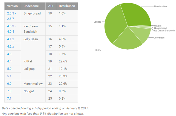 Sementara itu, versi OS terbaru Android 7.0 dan 7.1 Nougat masih mengalami pertumbuhan secara perlahan. Hingga bulan Desember 2016, OS yang pertama kali muncul di Google Pixel dan Pixel XL ini hanya memiliki pengguna aktif sebesar 0,4% saja. Namun sekarang, jika kedua versi tersebut digabung, persentase pengguna aktif meningkat menjadi 0,7%.