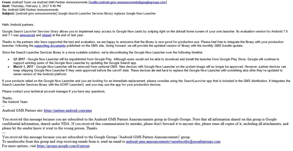 Kabar ini muncul setelah adanya kiriman email yang menyebutkan jika pada Q1 2017, Google akan resmi menghilangkan Google Now Launcher dari Google Play Store dan juga menyarankan bagi para vendor smartphone yang kebetulan menggunakan Google Now Launcher sebagai launcher utamanya seperti Motorola untuk menggunakan Launcher3.