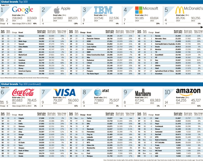 Di bawah Google dan Apple, berturut-turut ditempati IBM (nilai 107.541), Microsoft (90,185), dan di posisi lima besar ditempati restoran siap saji McDonald’s dengan nilai 85,706. Sementara perusahaan teknologi lainnya yang masuk 10 besar top brand global adalah AT&T di posisi 8 dan Amazon yang menempati peringkat 10 besar.