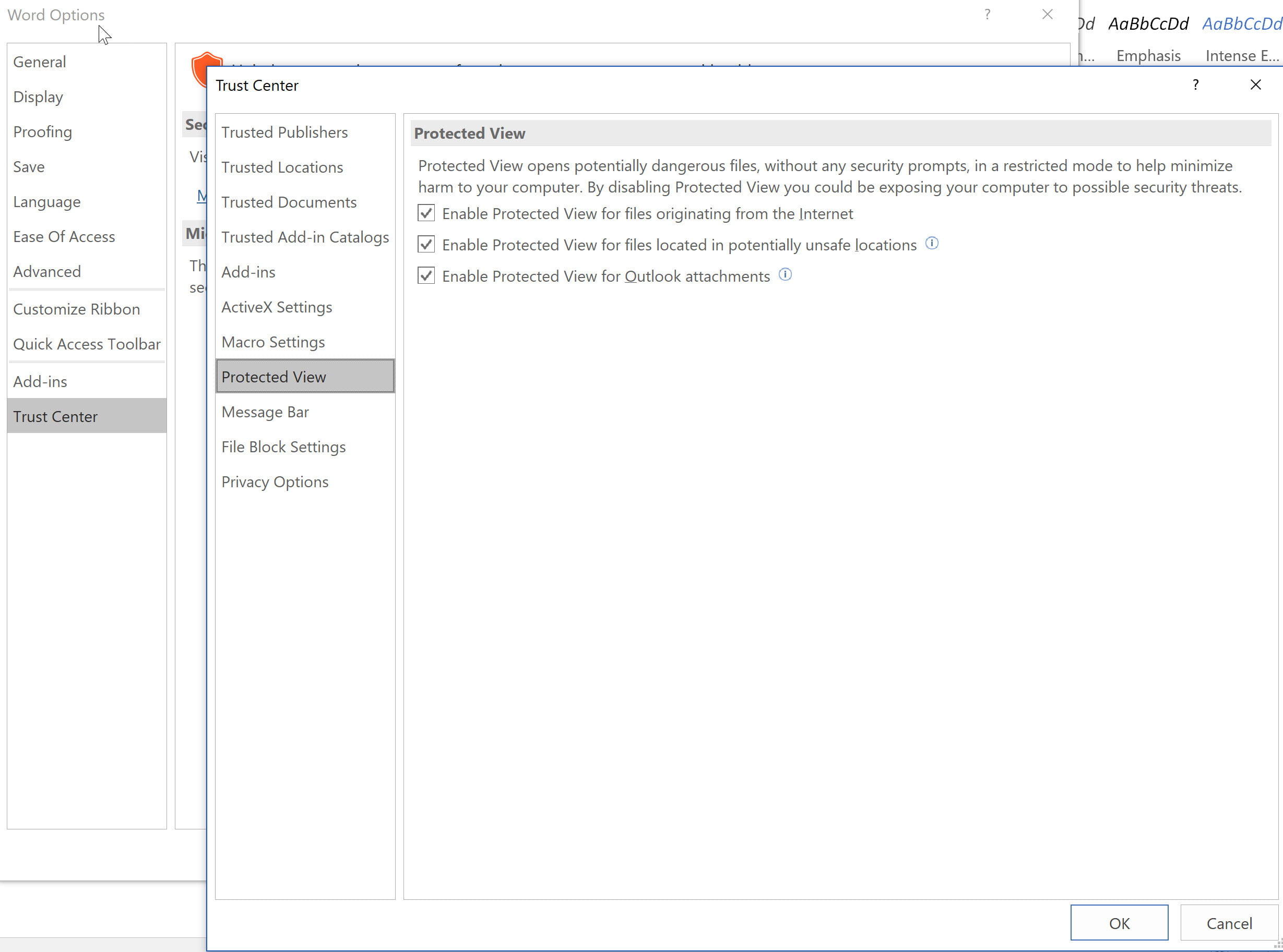 Setelah itu akan muncul kotak dialog baru dan cari Trust Center. Setelah itu, cari Protected View dan ceklis semua pilihan yang ada di tab tersebut. [FHP/HBS]