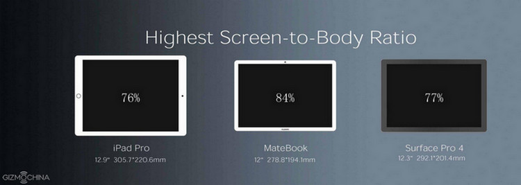 Untuk spesifikasinya, Matebook memiliki layar IPS LCD 12 inci dengan resolusi 2160×1440 piksel. Sebagai perbandingan, iPad Pro memiliki resolusi 2732×2048 dan Surface Pro 2736×1824. Matebook juga unggul screen-to-body ratio dengan 84%, sementara iPad Pro (76%) dan Suraface Pro 4 (77%).