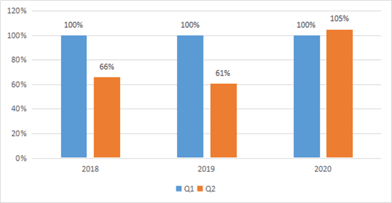 Misalnya, jumlah serangan pada Q2 2019 turun 39% dibandingkan dengan Q1 2019, dan pada tahun 2018 perbedaan antara dua kuartal adalah 34%.