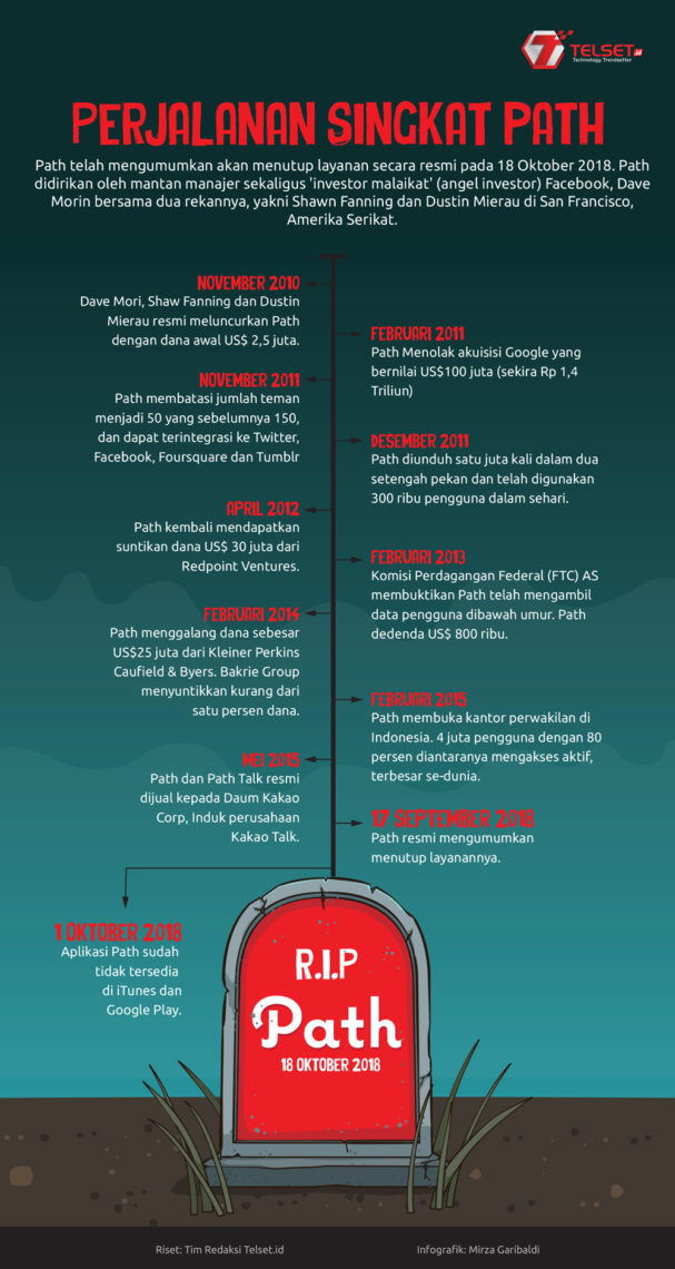 Path telah mengeluarkan pernyataan akan menutup media sosial yang telah berdiri selama delapan tahun itu di situs resminya pada 17 September lalu. Dan tanggal 1 Oktober nanti, aplikasi Path sudah tidak tersedia di iTunes maupun Google Play. Path akan menutup aksesnya di tanggal 18 Oktober dan pada tanggal 15 November layanan pelanggan yang berkaitan dengan Path akan diputus.