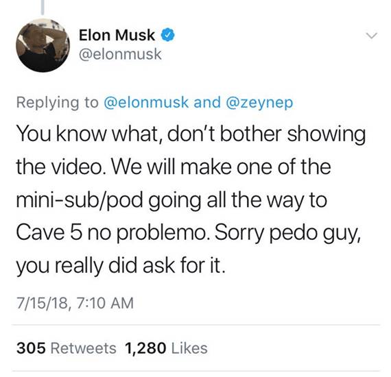 Musk geram lantaran salah satu tim penyelam yakni Vernon Unsworth mengkritik kapal selam mini milik Musk dengan berpendapat kalau kapal selam mini itu hanya pencitraan Musk semata.