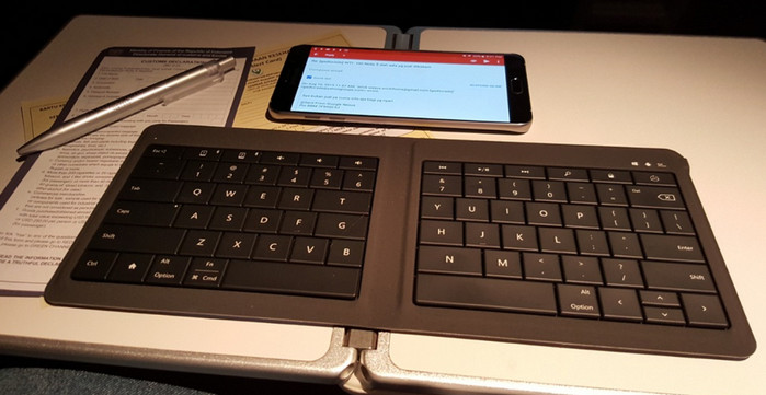 Keyboard lipat seperti Microsoft keyboard yang tipis sangat nyaman dan mudah untuk dibawa, jika ingin lebih murah bisa melihat keyboard bluetooth seperti Logitech atau brand-brand Tiongkok yang terkenal ekonomis. Semuanya mudah tersambung secara wireless ke smartphone dan tidak harus dikeluarkan dari tas selama pemeriksaan di airport. Beberapa negara sering melakukan random check pada pembawa laptop, ini memakan waktu, apalagi jika kita sudah mepet waktu harus boarding ke pesawat.