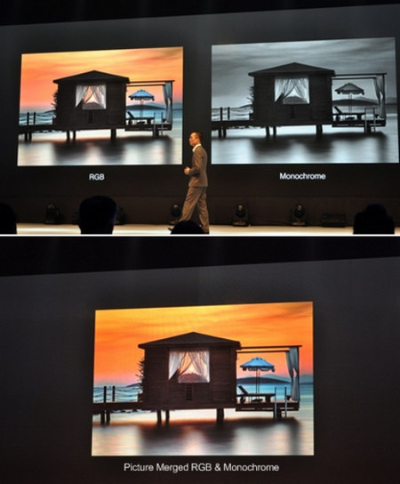 Sensor kamera tanpa filter warna ini menghasilkan foto dengan terang gelap yang jelas dan tajam. Kemudian hasilnya dipadukan dengan gambar yang sama dengan sensor RGB, sehingga diharapkan mendapatkan foto berwarna dengan ketajaman yang lebih dan kontras yang bagus, termasuk foto-fota saat kondisi temaram.