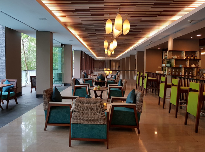 Ini cafe yang menjadi bagian dari lobi hotel Marriott, uniknya satu sisi bertahan dengan pencahayaan buatan untuk memberikan ambien hangat, satu sisi lagi jendela-jendela besar menghadap ke kolam renang dipenuhi cahaya.