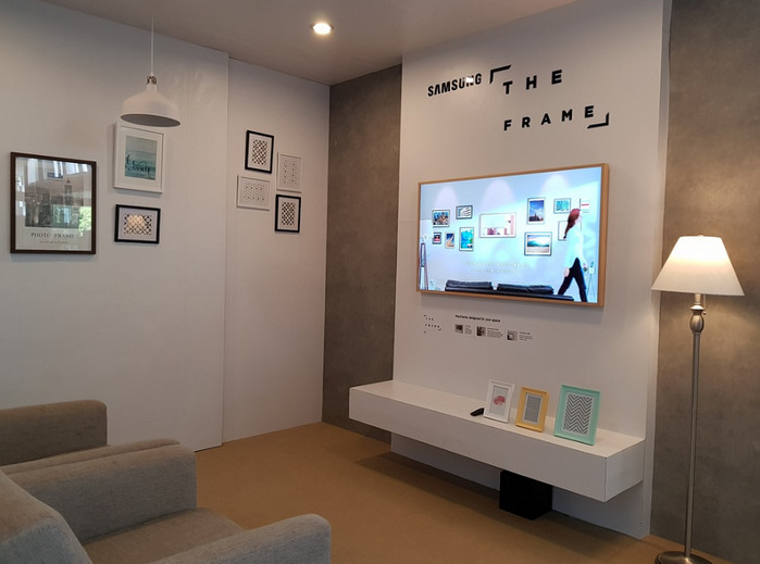 Ini ruang keluarga rekaan untuk demo next Samsung Frame, televisi yang bingkainya sudah seperti lukisan dan bisa diganti-ganti. Ketika sedang tidak menonton, televisi ini bisa untuk menampilkan lukisan-lukisan maestro dunia yang sudah tersedia di dalamnya, atau foto-foto keluarga. Ketika sedang menampilkan foto dan lukisan, sekilas sulit dibedakan dengan figura asli.