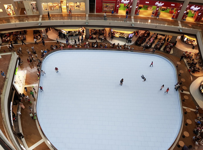 Area ice skating ini difoto sambil bergerak saat turun dari eskalator lantai atas. Mungkin banyak yang tidak tahu, kebanyakan kita akan mem-foto ke arah Marina Bay Sands, sedangkan di lantai atas mall ini, ada ruang terbuka lengkap dengan tempat duduk susun ke arah sebaliknya, untuk melihat ke arah teluk dan Merlion, memandang Singapura dari sisi lain.