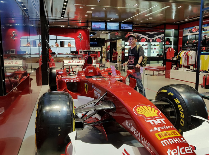 Itulah kenapa kamera smartphone kita sebaiknya bisa cepat di akses, cepat fokus dan cepat shutter-nya, karena toko-toko di mall melarang untuk foto-foto. Foto ini diambil dari luar, dari depan kaca etalase, saat rekan di dalam memberi kode minta difoto ganteng di sebelah mobil F1.