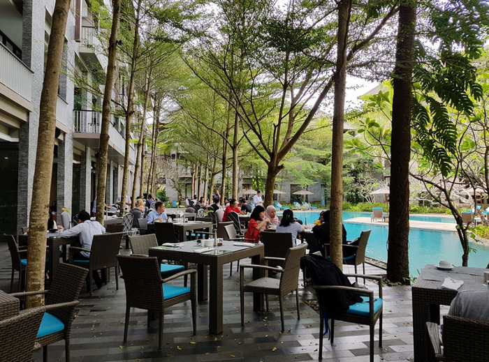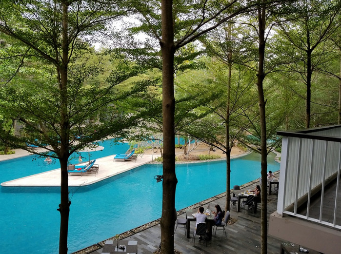 HDR yang bisa dinyalakan terus atau di set auto pada Galaxy S8 untuk menyerahkan algoritma-nya kepada sensor kamera smartphone, membuat foto ini bisa tampil natural dengan warna kolam tetap biru menarik, hijau daun dengan berbagai gradasi, dan batang pohon yang tetap terlihat coklat dan tertangkap detailnya tanpa menjadi siluet. Orang-orang di bawah yang sedang bersantap juga tertangkap dengan baik, juga detail lantai dan batu di pinggiran kolam.